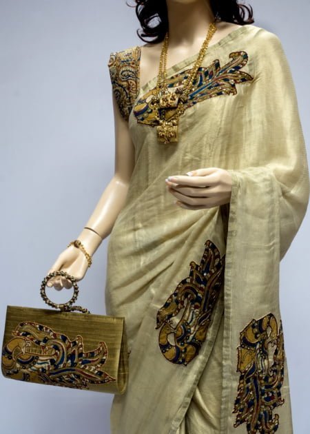 Beautiful clutch bag with matching Crepe tissue jacquard saree with Hand painted Kalamkari motifs, zari outlining & zardosi work; with blouse piece.